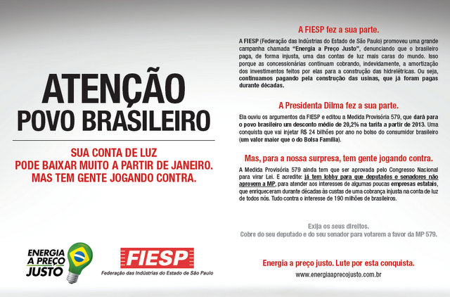 A campanha publicitária iniciou após a presidenta Dilma chamar as falas a FIESP. Os empresários reclamavam que o custo da energia elétrica no Brasil estava prejudicando a competitividade da indústria nacional. Dilma montou o marco regulatório da renovação antecipada da concessão das usinas hidrelétricas que estão vencendo, de forma a reduzir a tarifa. Passou a enfrentar resistência de parlamentares ligados as empresas geradoras de eletricidade, a maioria estatais sob controle de governadores tucanos. Os empresários da indústria, os maiores beneficiados, estavam quietos, diferente do que fizeram na época da CPMF. Com a pressão da Presidenta, se mexeram.